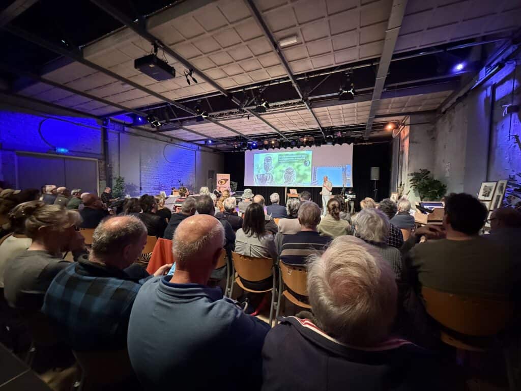 De internationale touch aan deze dag werd gegeven door de Belgisch/Vlaamse schrijver Dries van Nieuwenhuyse die het nieuwe boek “Godin van de nacht/biografie van de steenuil” presenteerde. Dit is een prachtig naslagwerk voor het Nederlandse taalgebied over steenuilen, onmisbaar voor iedereen die steenuilen een warm hart toedraagt. Het bevat prachtige illustraties, veelal gemaakt door Joris van Raedt, ook de hele dag tekenend op het podium aanwezig. De dag werd opgefleurd met mooie foto’s en videobeelden van de steenuilen en diverse presentaties. Aan het eind van de middag gingen we na een korte pauze verder met een quiz waarin de deelnemers werden overhoord over nieuw opgestoken kennis van de steenuilen. We konden hierop inloggen middels een QR code en live te volgen via overhead presentatie van de resultaten. De dag werd afgesloten door Jouke Altenburg namens de “Nederlandse Ornithologische Unie” en mede auteur van de Nederlandse vogelatlas. Hij presenteerde de vogel van het jaar 2026, het zal u niet verwonderen dat dit de steenuil is. Hij kondigde ook de viering van het 125 jarig bestaan van de unie in 2026 aan. Dit feest zal gehouden worden op 7 maart 2026, opnieuw in de Gelderlandfabriek in Culemborg.